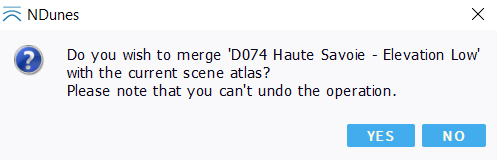 Then, we create another atlas and drop the two atlas we have calculated onto it. NDunes offers you to merge the incoming atlases within the new one. We accept both merges so that we create a combined atlas with the two elevation layers (2) and (3):