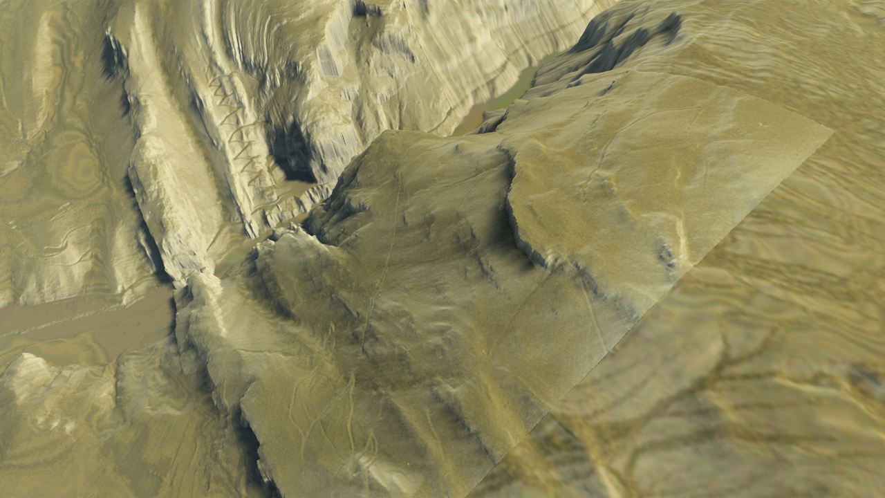 You can notice a relief discrepancy between the world cartography layer (1) and the high resolution layer (3). This is due to the different sampling resolutions: The world layer (1) is sampled at 1 kilometer resolution while the high resolution cartography layer is at 1 meter resolution. Please also note that at 1 meter resolution or lower, generating large areas can quickly become expensive in terms of memory consumption and disk storage.