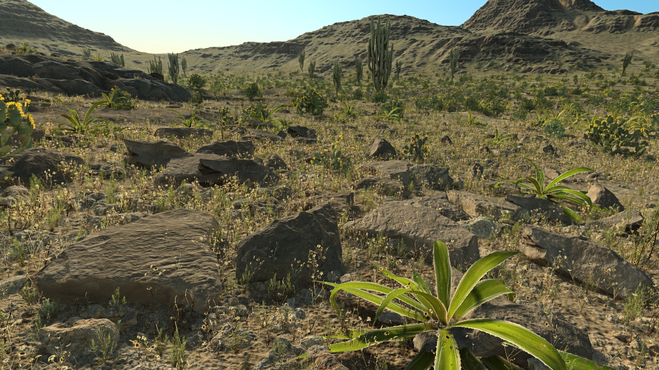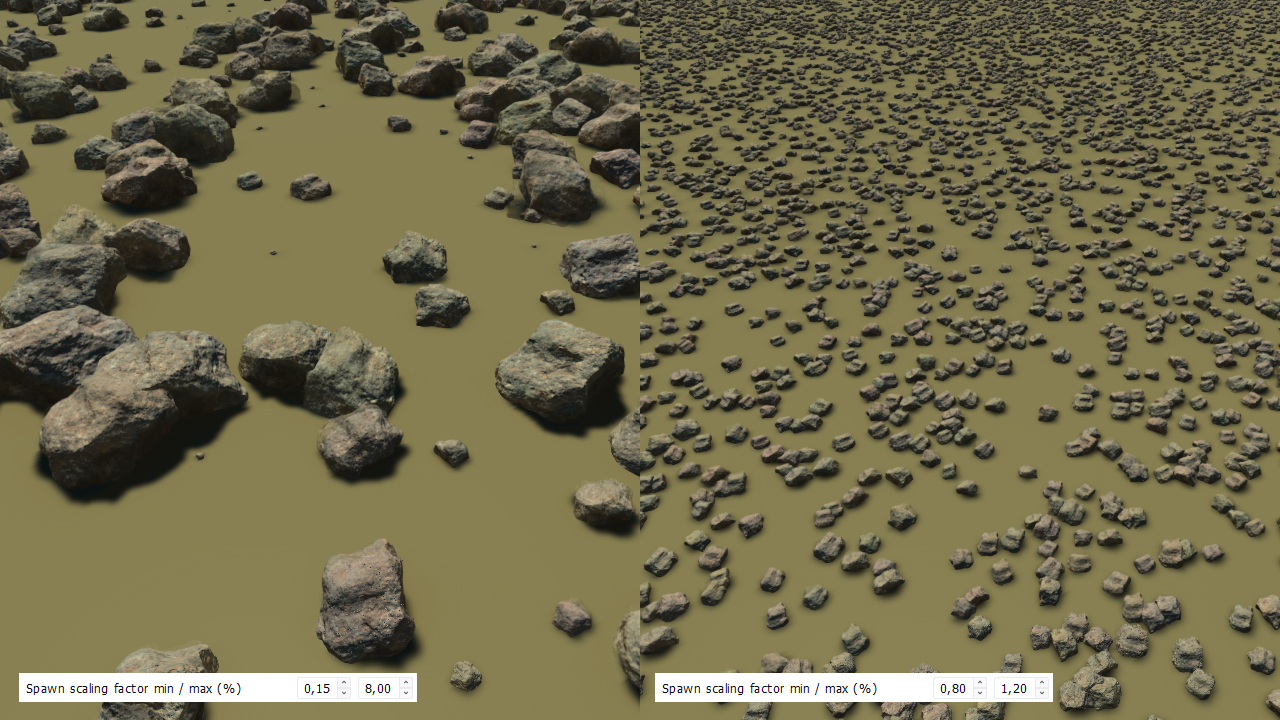 While this should be carefully used for vegetals, this parameter is often really useful to add variations on stones and rock meshes over the ground. Below is a desert terrain sample with lots of rocks scattered over the ground. The randomness is very high. The number of big rock models used is very low (only 3):