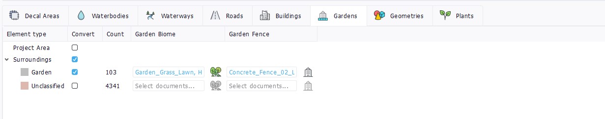 A specificity for Gardens is that shapes coming from Cadastre or BDParcellaire are automatically divided between "Garden" and "Unclassified" categories. These categories are created by NDunes, they are not part of the input 2D data. NDunes determines wether the input polygon is a real garden or not depending on several parameters such as size, number of included buildings, etc. Polygons that do not look like gardens are categorized as "Unclassified" and, by default, are not converted. Shapes coming from other sources such as CUSTOM will not undergo this classification.