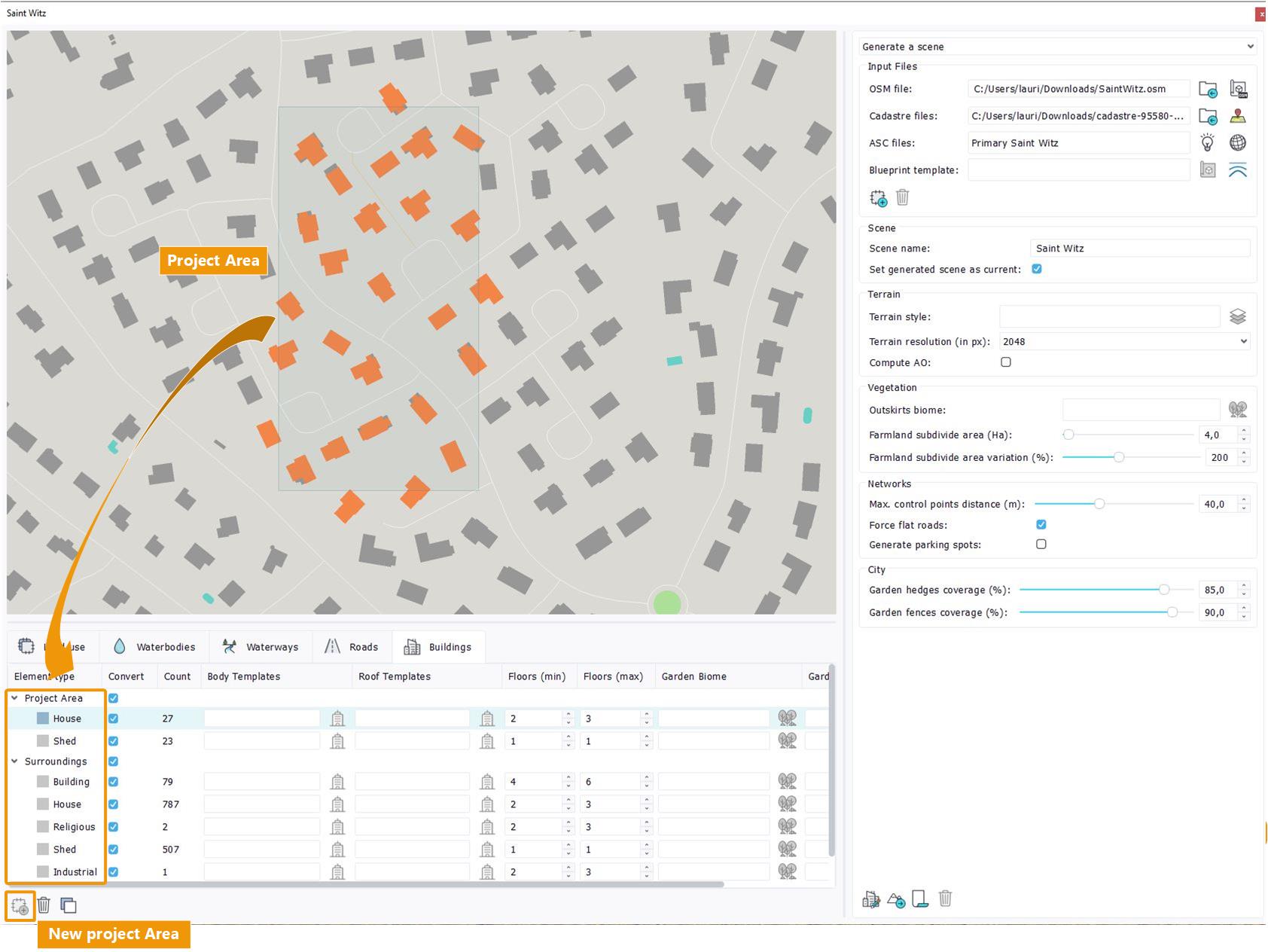 By default, all OSM objects are classified as "Surroundings" in NDunes. If you want, you can create a project area around your main point of interest in the map, to customize the OSM objects differently in this zone. For example, you could set higher quality assets in your project area. Or you could chose not to generate the objects at all in your project area if you choose to use exact models from a modelling software instead.