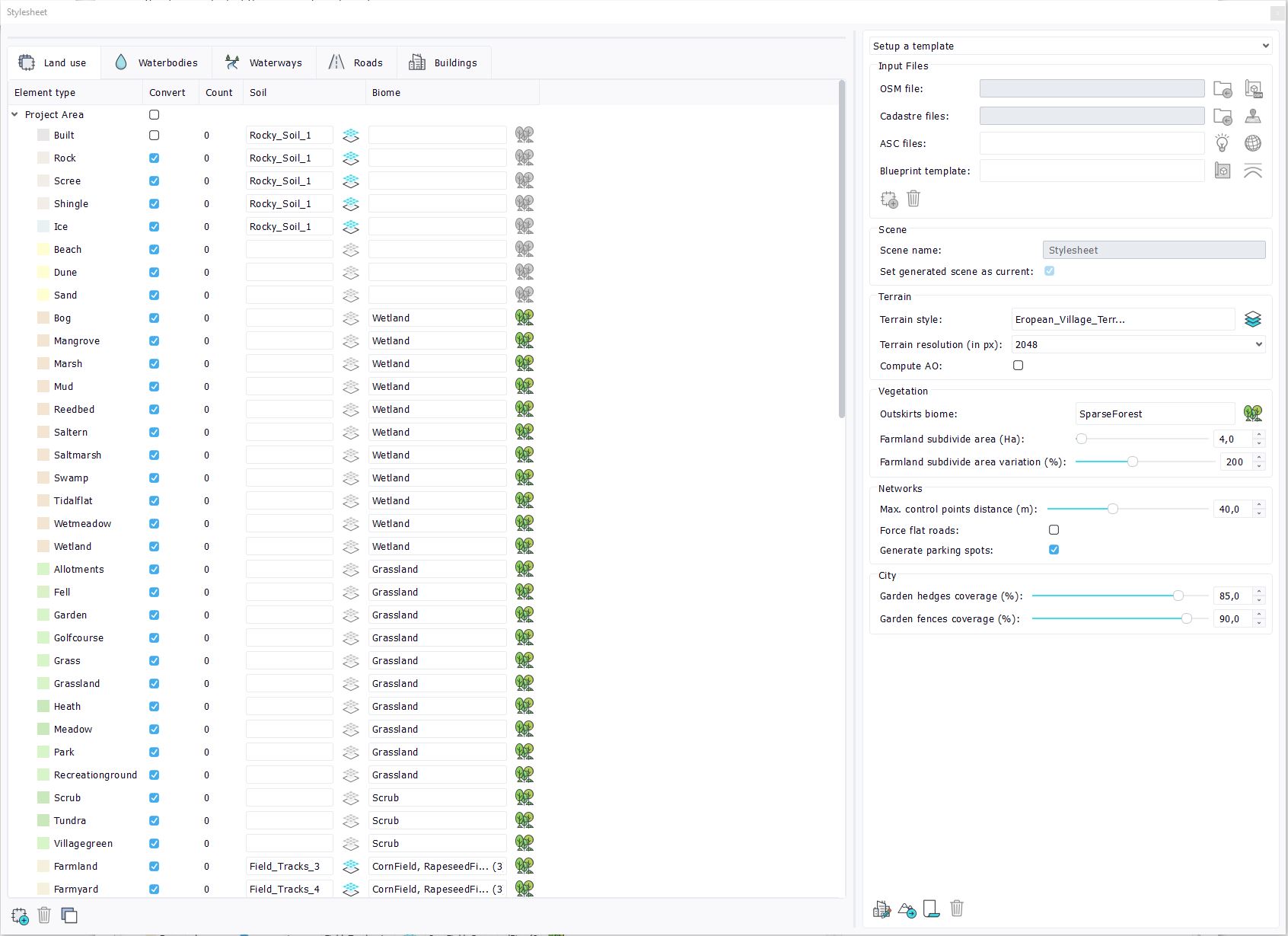 - Blueprint stylesheet(s): a set of blueprint documents in stylesheet mode, used to specify all the 3D templates to apply to the generated objects. These files are optional, you can either specify manually in the blueprint all the templates for your scene without using a predifined stylesheet, or even generate without templates at all and then apply everything in the 3D viewport. These are NDunes files, that can be downloaded from our Store, or created in NDunes. To learn more about stylesheets, see Creating your own stylesheets.