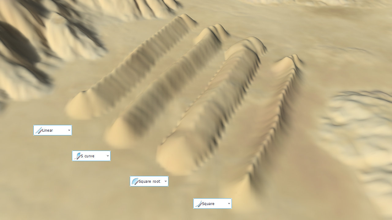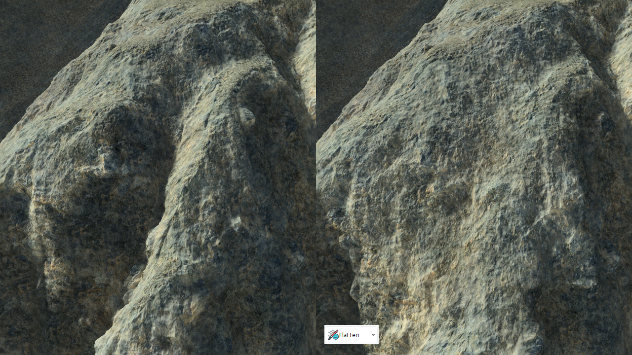 The elevation channel of the right side of the image has been flattened. Then, the radial strength of the brush can be also modified using the profile of the brush: