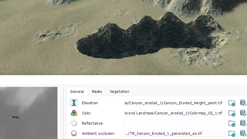 As we can see, the name of the elevation channel file has been modified and a '_paint' suffix has been added to it. Note that node graphs for that channel are still present. Regenerating the node graph for the channel will overwrite the brush paint, so please be careful on that.
