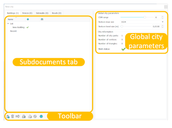 - This is where the buildings, fences, sidewalks, and roads will be placed when created. Each of these tabs contain two separate lists. The "List" list contains the list of all the sub documents created in the City, while the "Recent" list contains the recently created or used sub documents. The tabs also contain a column for the validity of the sub documents, and another column for the save state of the sub document.