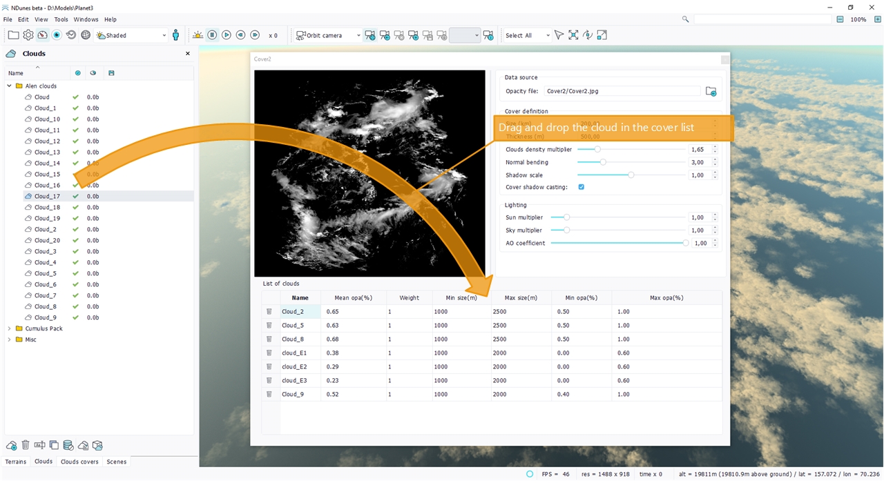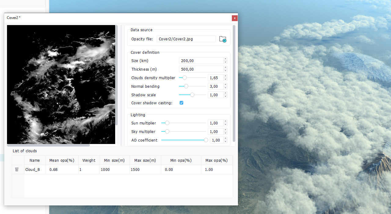 - The cloud's dimensions: defined by a minimal and maximal size. Note that getting too low here (for instance below 500 meters for a cover that is 500 kms wide) will generate a ton of clouds and performance will drop.