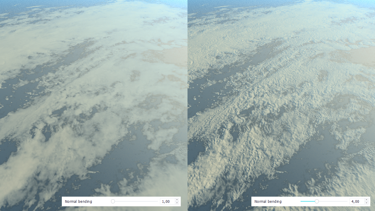 The first parameter can be used to provide a bit of bumpiness to the clouds cover. The cover itself has no thickness as its a texture mapped onto the planetary surface. So adding a bit of normal bending will generate some bumps - like in a normal map calculation - over the cover: