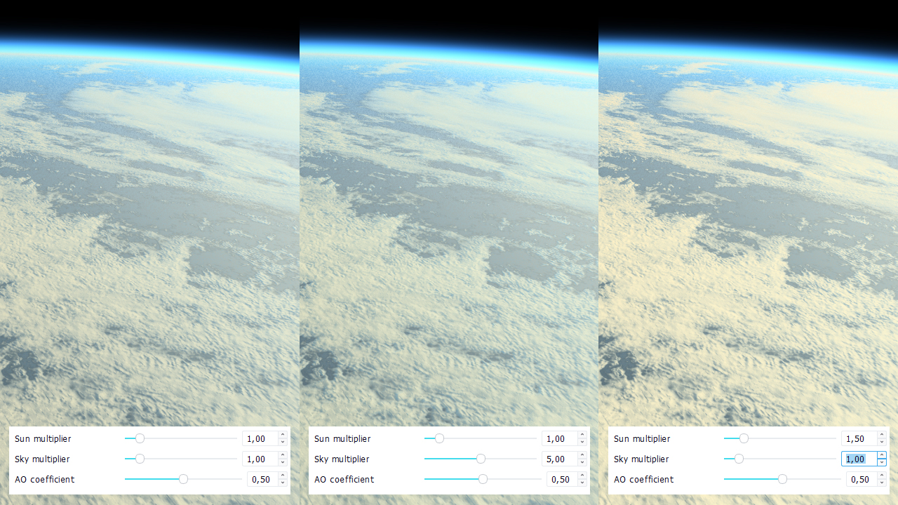 Then, there are three lighting parameters that can be modified to change the cover lighting and the way it reacts to the sun and sky lighting: the sun multiplier, the sky multiplier and the ambient occlusion coefficient. Like for all rendered elements in NDunes, the ambient occlusion still plays a role in estimating the amount of light interaction with other elements of the scenery. Below is an illustration of a few settings values: