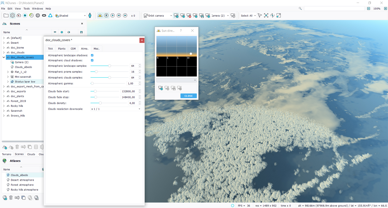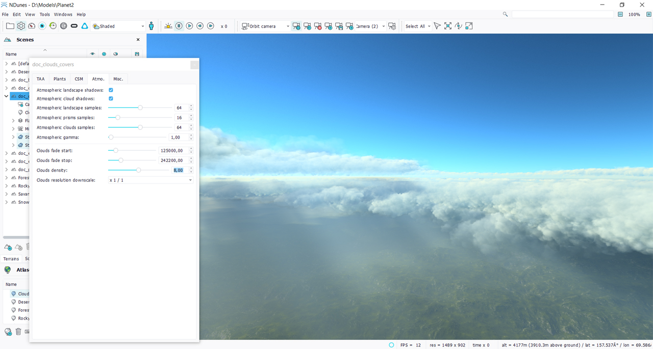 - The atmospheric clouds shadows option that toggles the atmospheric shadow casting. Note that this parameter is related to the clouds cover "shadow scale" parameter (found inside the clouds cover document) that can be used to strengthen or reduce the opacity of shadows produced by the clouds cover. Several clouds covers cast shadows each onto another. Clouds cover shadows modify the tint of the sun and sky of the landscape and plants being illuminated.
