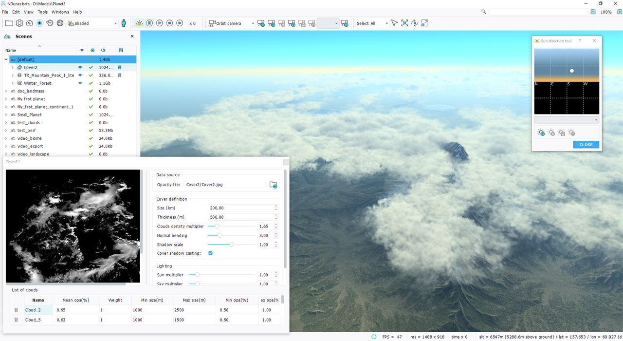 - The clouds cover can also cast shadows or not. It's interesting not to waste time casting shadows for clouds covers for example for high cirrus layers that will not have any visible effect anyway.
