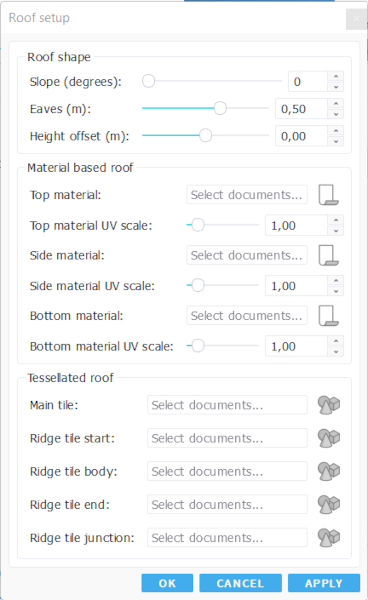 In the Roof panel, the user can set either textures or models for the roof. There are also a set of parameters to customize the roof.