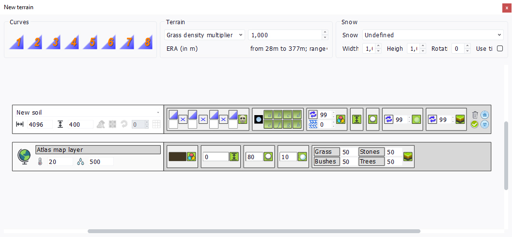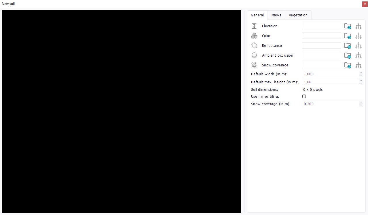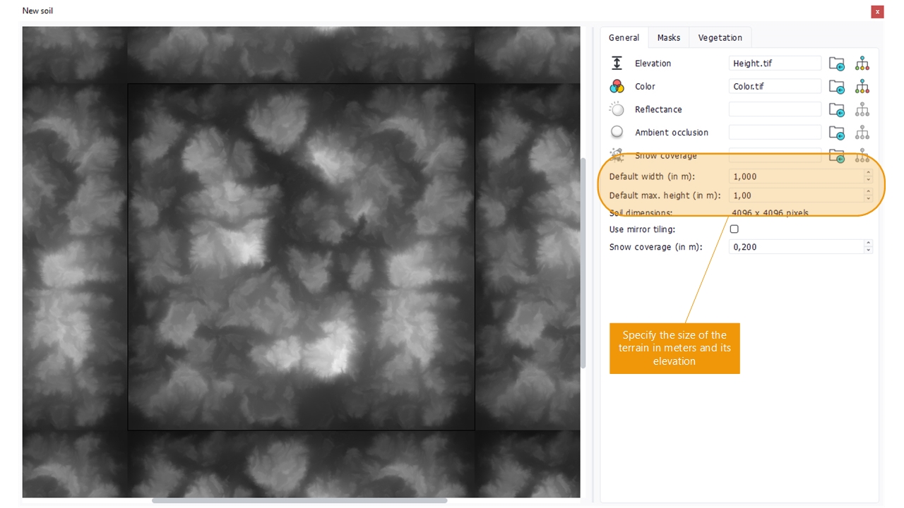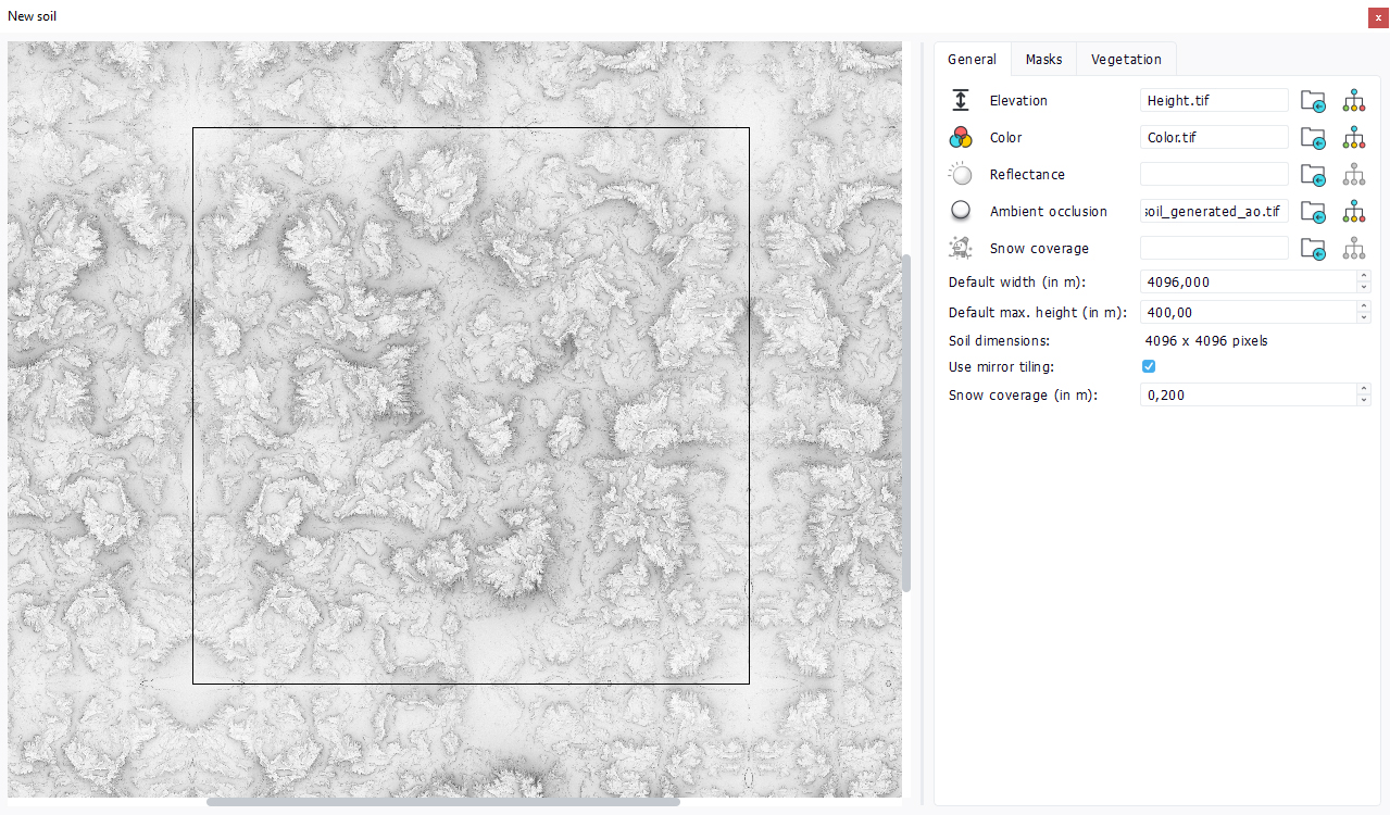 We'll setup a 4 kilometers terrain (1 texel = 1 meter) and say this terrain is 400 meters high. These values are indicative and can be changed afterwards in the terrain directly. However, they're important as the soil ambient occlusion field (AO) will be defined from them.