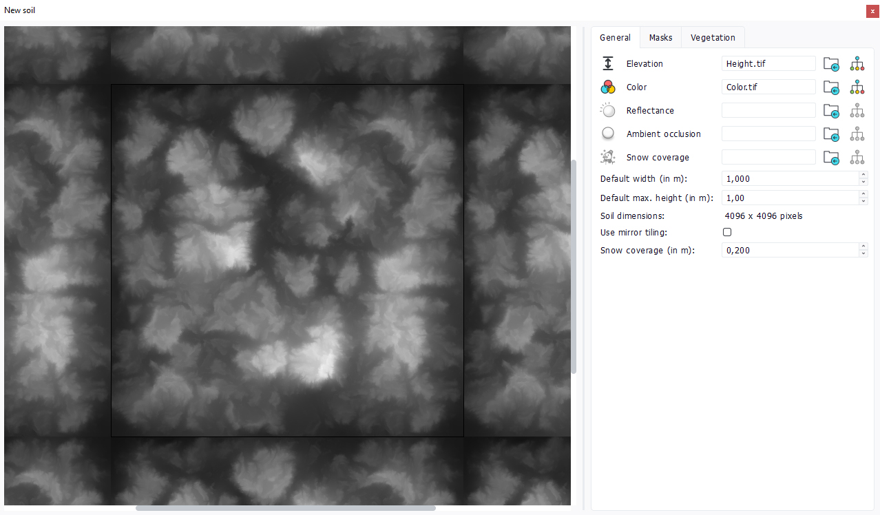 At this stage we have a basic simple soil that can be used and visualized in a terrain. Just as as side note, if the source maps did not tile, the "use mirror tiling" button can be activated to display the soil with a mirrored tiling, making it look nicer.