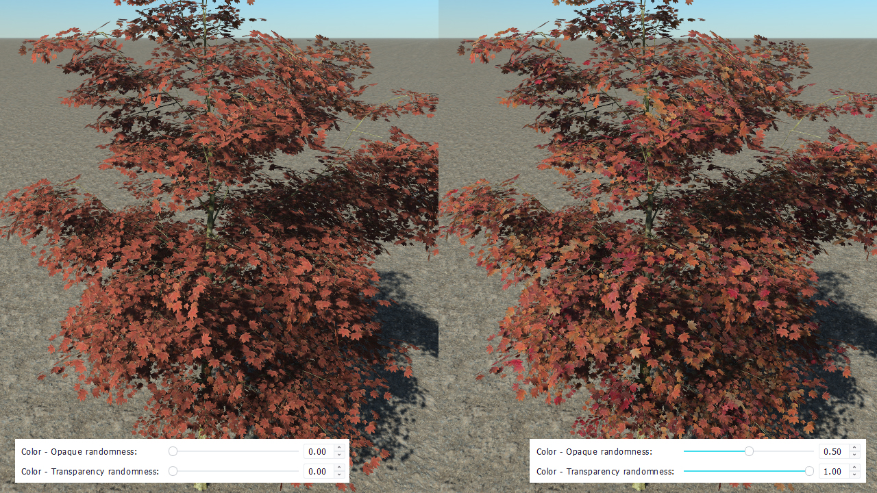 These randomization parameters apply some subtle tint variations on plants: diffusion maps, reflectance and translucency can be modified. This is illustrated below: