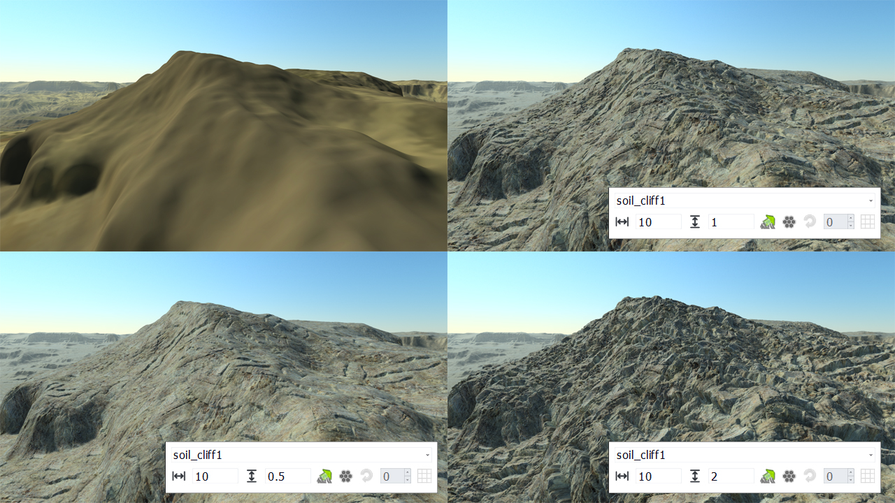 In the picture above, the left size image has the distortion disabled so we can see quite smooth transitions between the colors of the soil (the secondary soil showing the small gravels uses the color OVERLAY). In the right image, the distortion is maxed out which creates very visible distortion patterns and sharp breaks between colors.