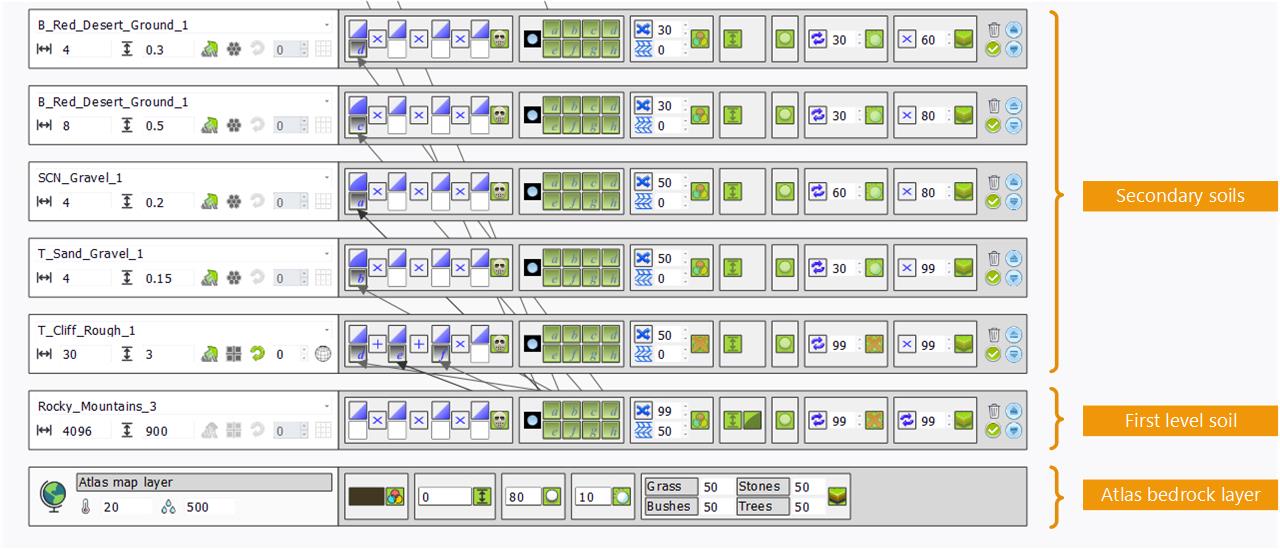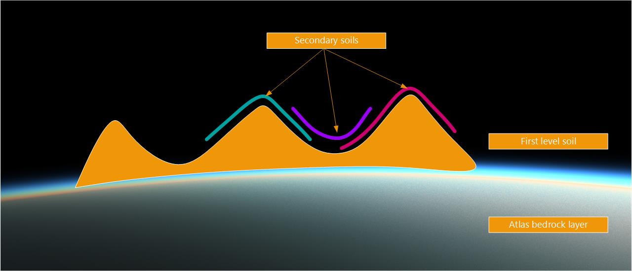Each terrain layer influences layers after it. So the atlas layer modifies the first level soil and the first level soil modifies secondary soils: this architecture is at the core of the terrain design and helpful to create variations from a single terrain when large scale continents have to be created.
