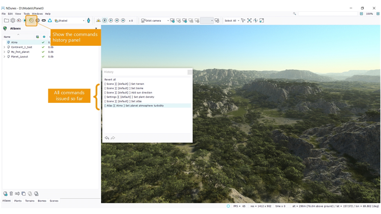 The commands history is a panel that relates all user commands issued from the session start. Most commands (except very specific ones) can be undone and appear in that list, as illustrated below: