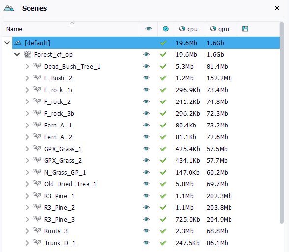 - Plants have both GPU & CPU memory costs due to the fact that they have meshes (kept in main CPU memory and rendered by the GPU) and textures (rendered on the GPU).