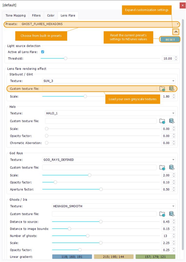 If you want to make your own preset, choose "Custom" from the preset's list, and define you own lens flare set of effects using the sliders. You can choose from the included flare textures or load your own for each effect (they must be greyscale textures).