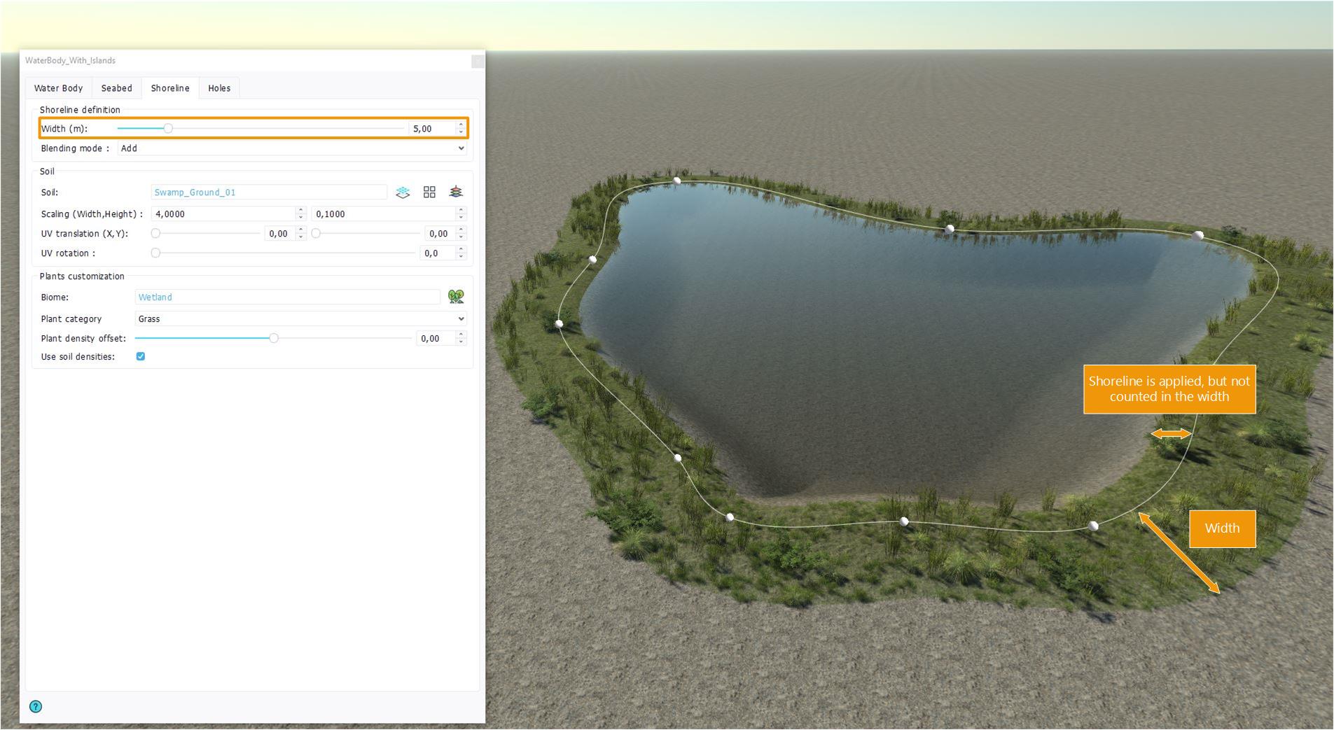 First, to create a shoreline area, go to the "Shoreline definition" section and set the width value of the shoreline. The width is in meters and starts from the waterbody curve, even though the shoreline specifications are also applied inside the curve and until the water surface.