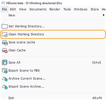 A working directory can rapidly grow up by storing dozens of useless files. A cleaning tool is available to list and destroy all the files under the working directory that are not used by any documents. It can be started by clicking the Clean Working Directory button in the File menu.