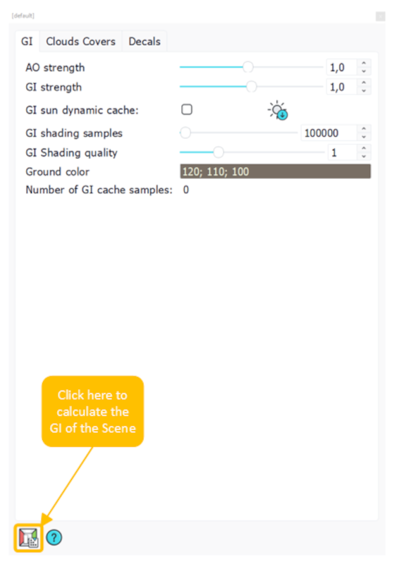 This will improve the look of the buildings and roads and make them more part of the scene. This will also calculate the Global Illumination for your model. If you are not satisfied with the GI on your model, you can calculate it specifically.
