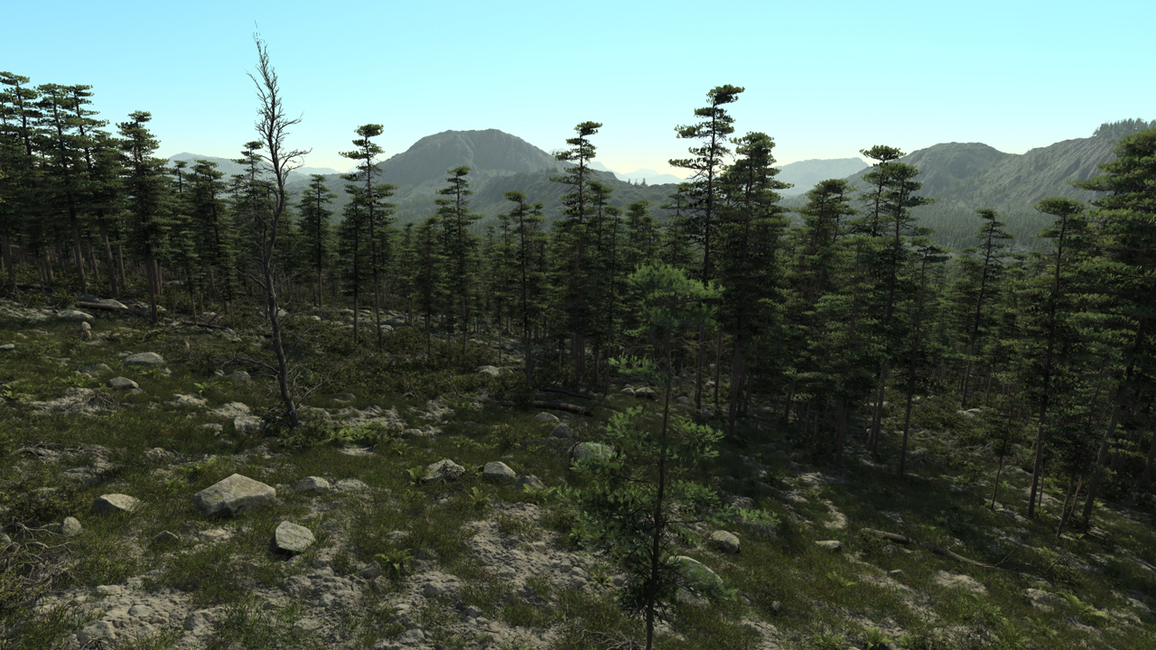The archive contains a complete biome and all its plants. Here it's shown in a scene using the Small European mountains terrain and the Summersky clouds cover:
