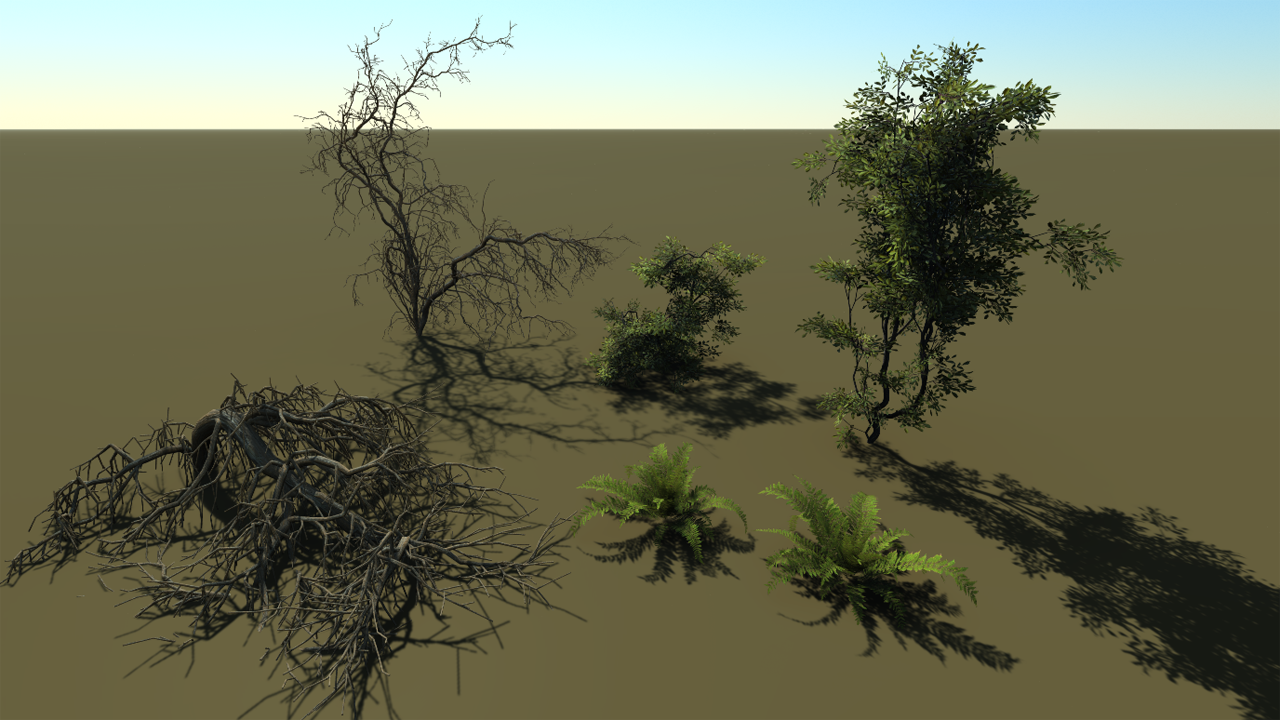 The biome currently has 17 plants in it in all 4 plants categories: grasses, bushes, rocks and trees. Below a sample with bushes and with trees: