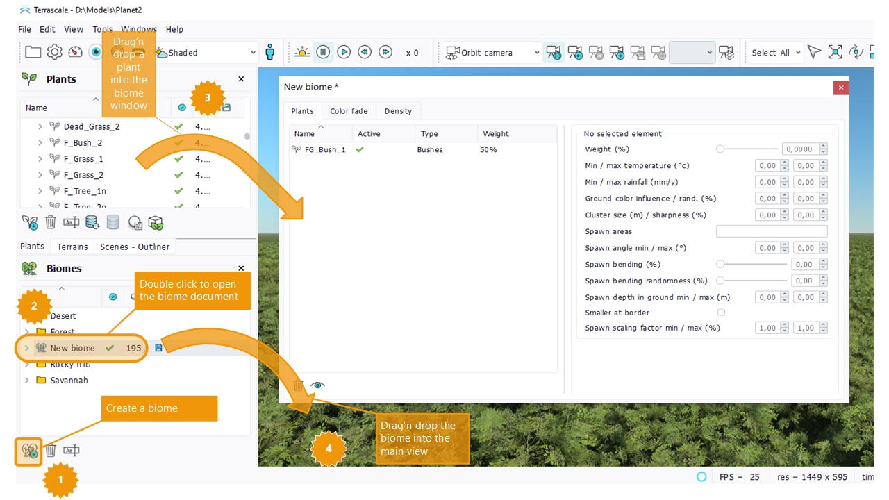 - Drag and drop the biome itself from its list into the main view. The biome is then added to the current scene. Note that it can replace any other biome. A terrain scene (with no compiled Atlases) has only one biome at a time.