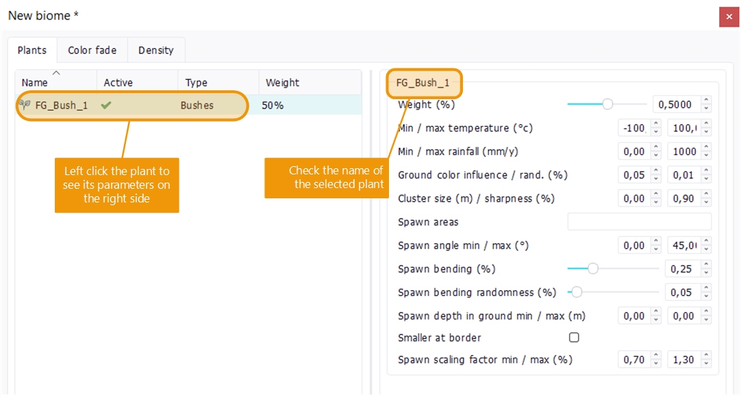 By clicking the left side of the biome document, we will have access to the spawning parameters for that specific plant on the right: