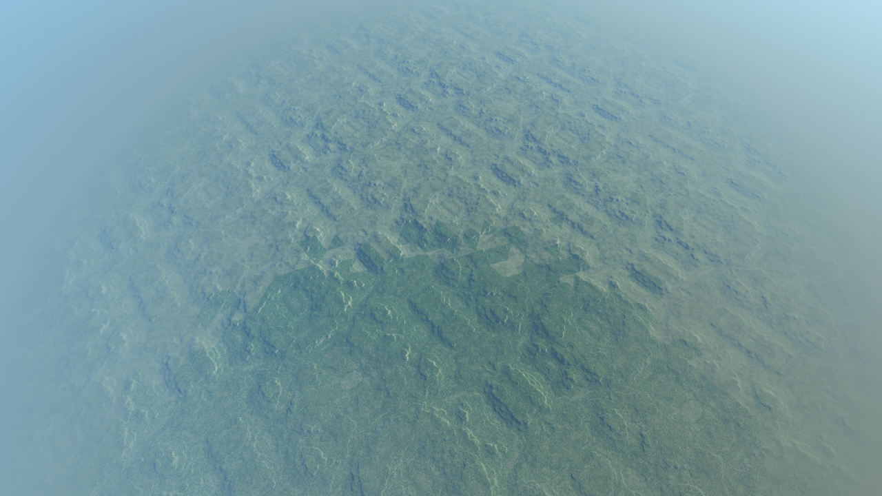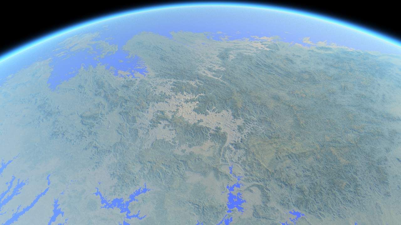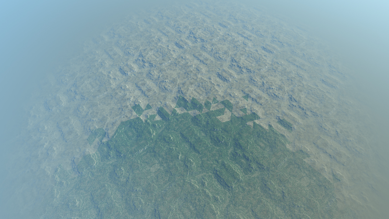 We see color breaks due to the seeding areas allowed for each plant. Consequently, each plant will imprint its colors on the landscape it covers. So the terrain does not need to be designed with plant coloring in mind and specific texturing to handle far away views. Plant coloring comes from biomes.