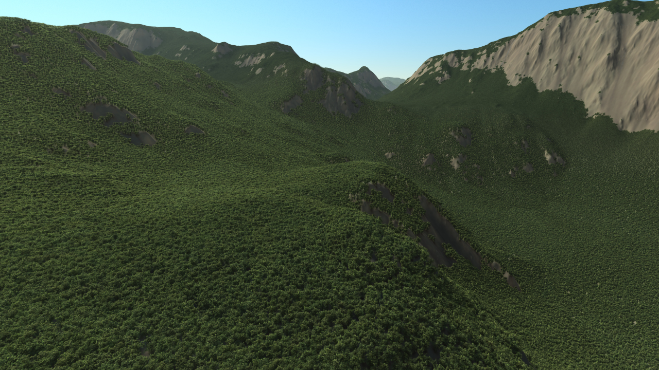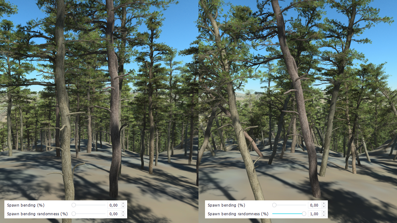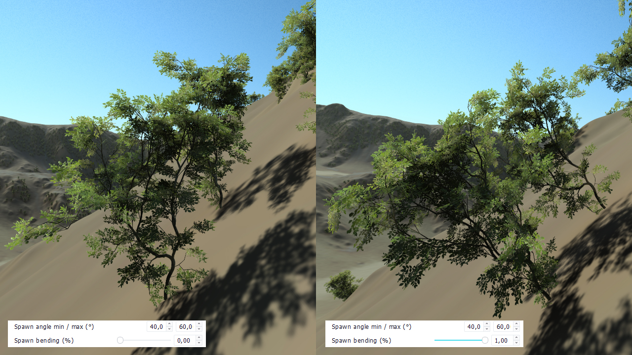 When seeded, a plant can grow up or laterally, following the slope of the landscape it is grown over. This is the "Spawn bending (%)" parameter that defines in which direction the plant will grow. At 0%, it will grow vertically and at 100% it will follow the landscape normal. Let's consider an example with a plant seeded on steep slopes (40-60 degrees), with a Spawn bending set to 0% and 100% (the density has been lowered for a better understanding):
