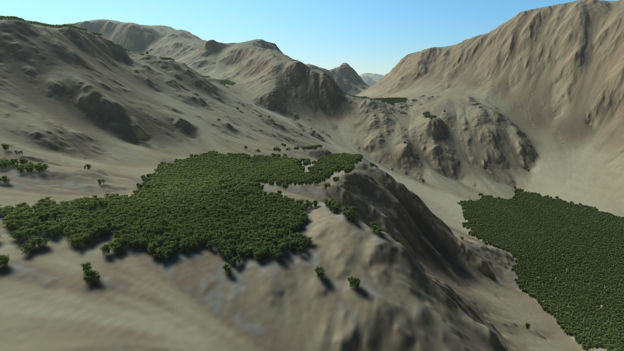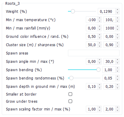 The "Spawn angle min / max (°)" parameter rules the slope of the terrain over which the plant is allowed to grow. By default a plant can be seeded on flat grounds (zero degrees) up to 45 degrees slopy areas. This can be changed to spawn plants on different surfaces of the landscape. Below is an example with the plant angular limits set to 0 - 10 degrees: