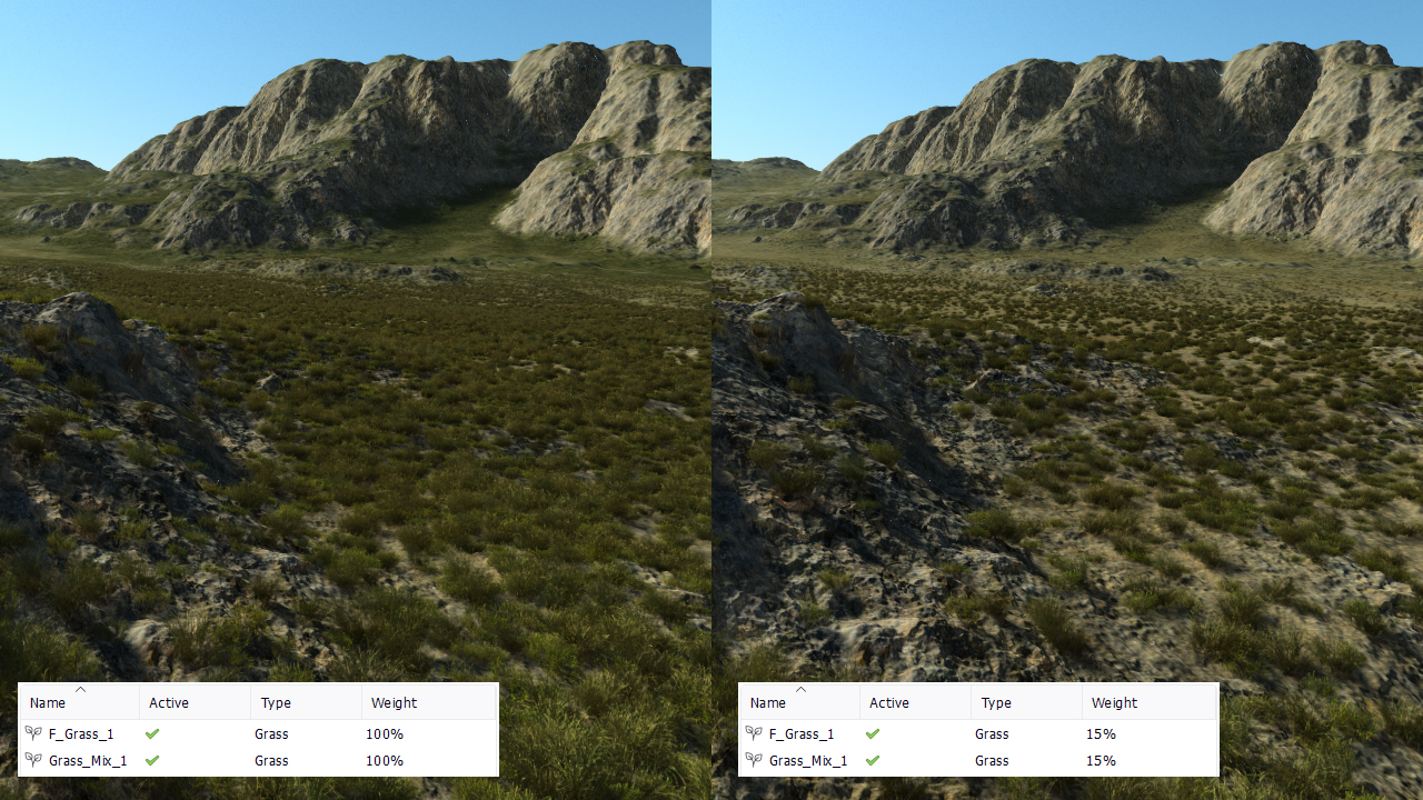 The weight has another behavior in the sense that it can be used to reduce the density of plants in an area. In the example below, we will use two grass patches. The left side image uses a 100% weight for each plant, resulting in even chances for each plant to be selected. The right side image uses 15% weight for each plant, still resulting in even selection chances, but with a total weight of candidates reaching 30%. Consequently, NDunes reduces the density as it cannot find enough valid candidates to reach the specified terrain density level: