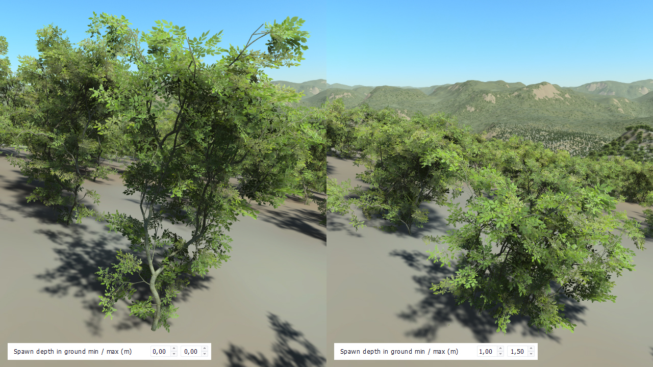 Finally a plant can be buried into the ground of a variable offset using the "Spawn depth in ground min / max (m)" parameter. This is a bounded offset in meters that is either added or subtracted to the spawn position to reposition the plant, as illustrated below: