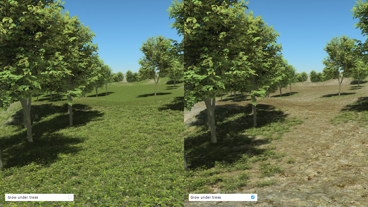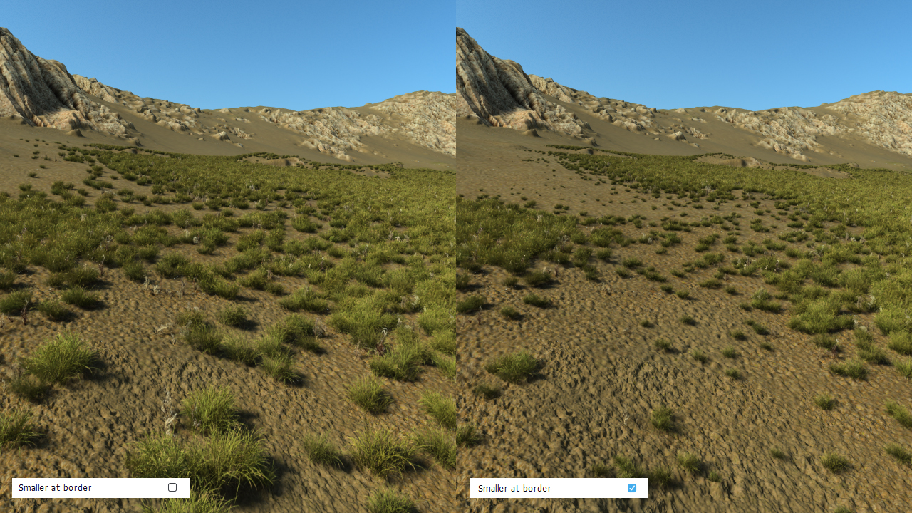 It may be useful to automatically reduce the size of plants when we reach the border of the density domain for that plant. This illustrates for instance the fact that we can see smaller trees on the edge of a forest or smaller grass patches when the soil gets too dry. This is an option that can be toggled by checking the "Smaller at border" checkbox. Below is an example with no size reduction on the left side of the image and the same scene with the "Smaller at border" option being checked on: