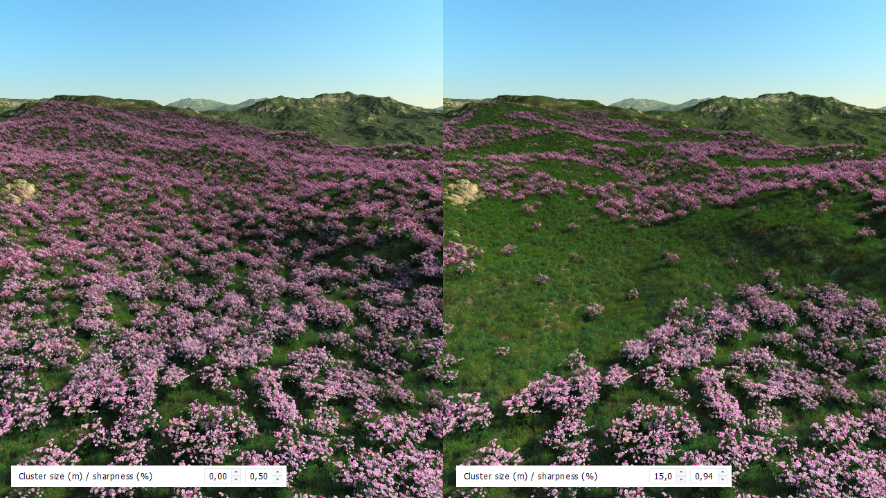 The idea is that some plants grow in tight groups rather than evenly scattered over a surface, by creating clusters of a given size in meters with a sharpness factor. This will automatically group plants based on a thresholded noise set at the frequency of the cluster size. An illustration is shown below: