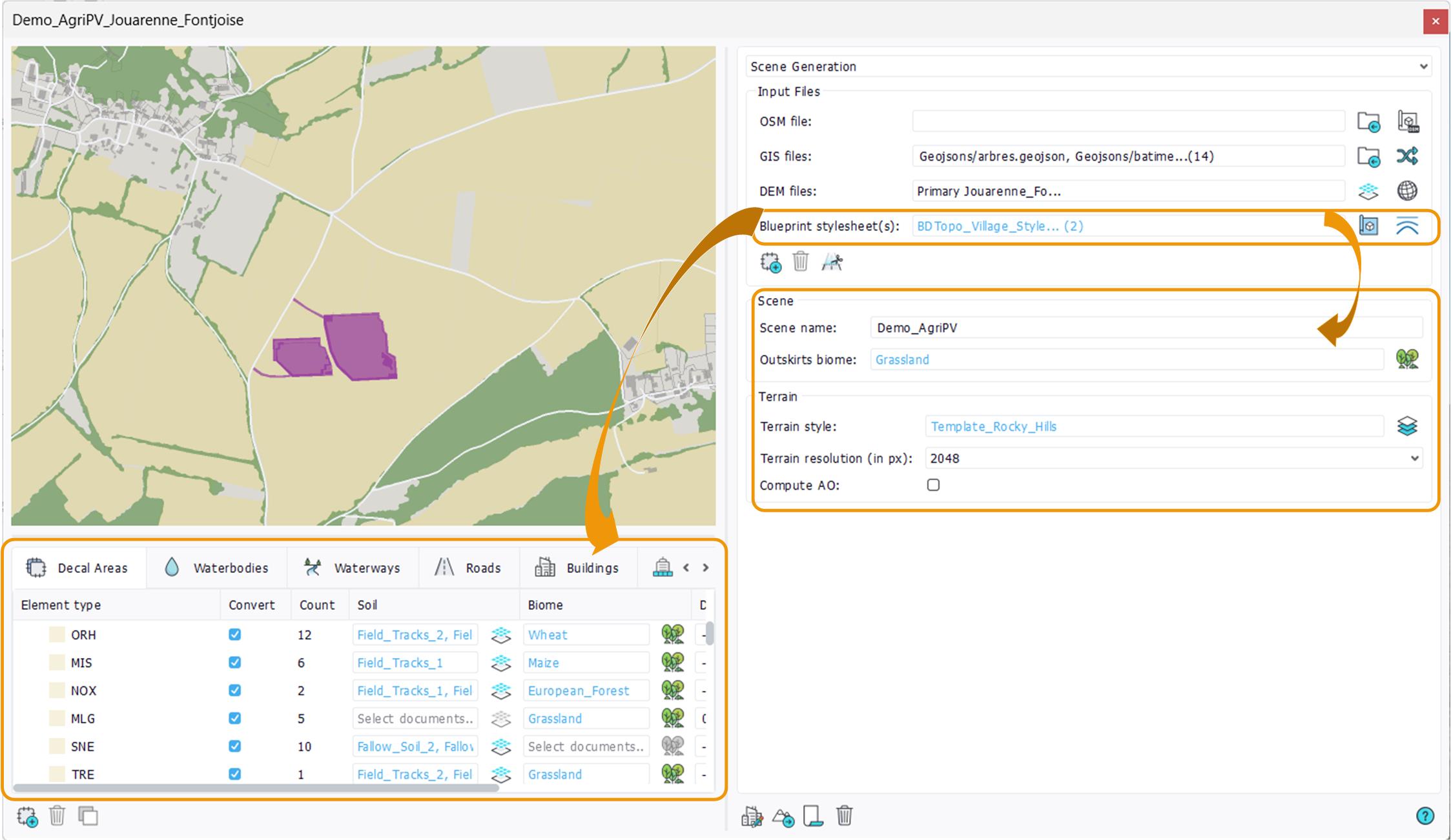 - Blueprint stylesheet(s): a set of blueprint documents in stylesheet mode, used to specify all the 3D templates to apply to the generated objects. These files are optional, you can either specify manually in the blueprint all the templates for your scene without using a predifined stylesheet, or even generate without templates at all and then apply everything in the 3D viewport. These are NDunes files, that can be downloaded from our Store, or created in NDunes. To learn more about stylesheets, see Creating your own stylesheets.