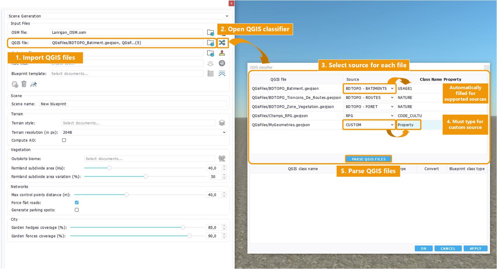 Be carefull when using OpenStreetMap AND BDTopo/RPG inputs. The software does not forbid you to do it but if you import the same object (for instance, a house) from OpenStreetMap and from BDTopo - BATIMENT, your house will be twice in the Blueprint, and then twice in the 3D scene. This will lead to important performance issues and possibly a bad rendering as well. What is recommanded is to use either OpenStreetMap or BDTopo, otherwise be carefull what you are doing and keep in mind this possible duplication issue !