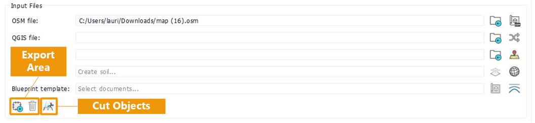 However, some imported objects (especially OSM landuse area or rivers and roads) may be very big and go way beyond your area of intersest. If this is the case, it can be intersting to cut them and remove the parts of the objects that go beyond the export bounds you have chosen. To do this, toggle the "Cut Objects" button.