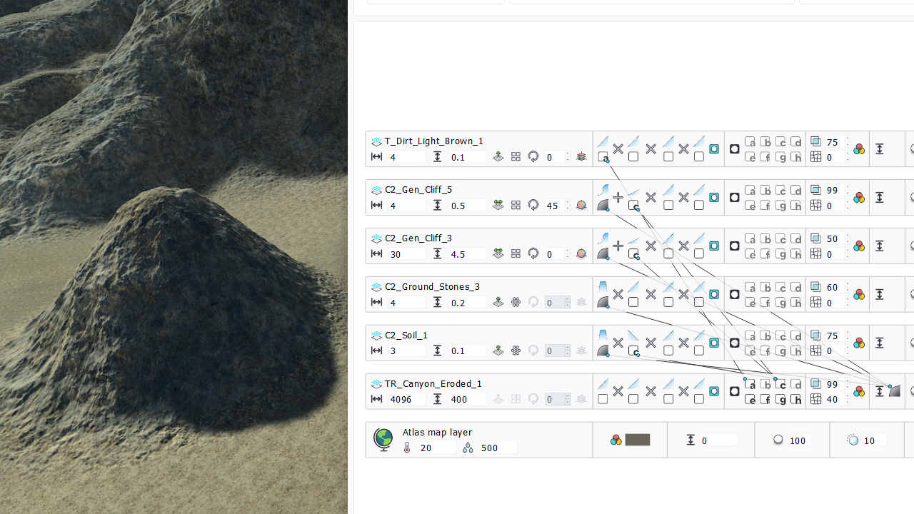 The terrain being sculpted here uses 5 secondary soils, most of which are using a slope based mask. The "C2_Gen_Cliff_5" soil is mapped onto high slopy areas, which gets automatically generated by raising the elevation with our brush.