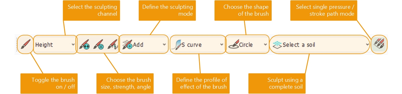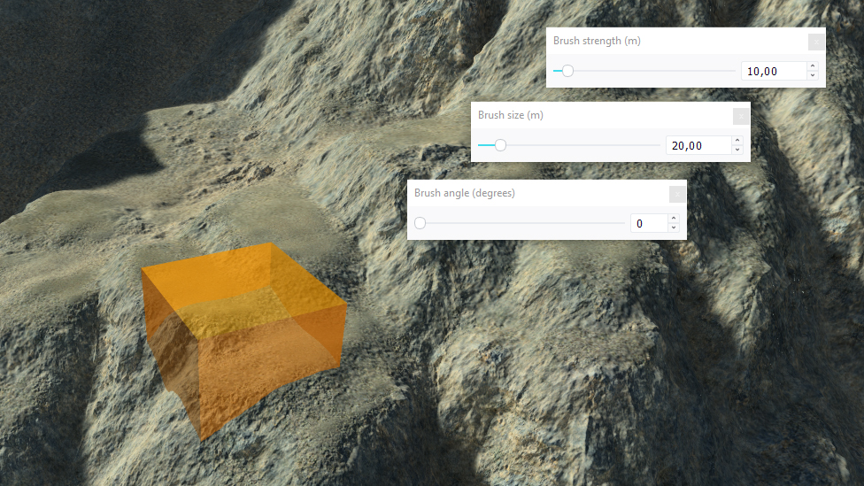 Note that depending on the sculpted channel, the brush strength is either a value in meters (when the height is sculpted) or in percentage (when other channels are sculpted).