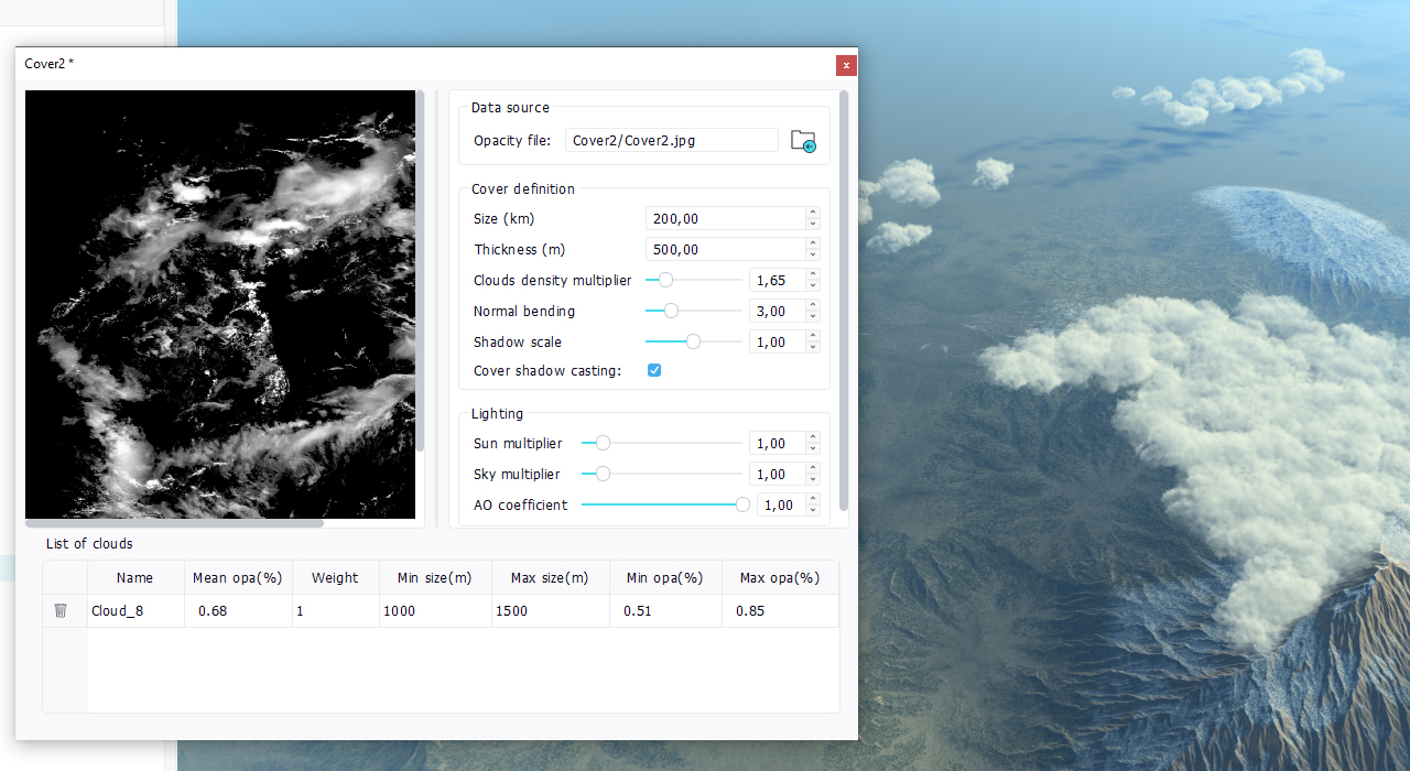 - The cloud's dimensions: defined by a minimal and maximal size. Note that getting too low here (for instance below 500 meters for a cover that is 500 kms wide) will generate a ton of clouds and performance will drop.