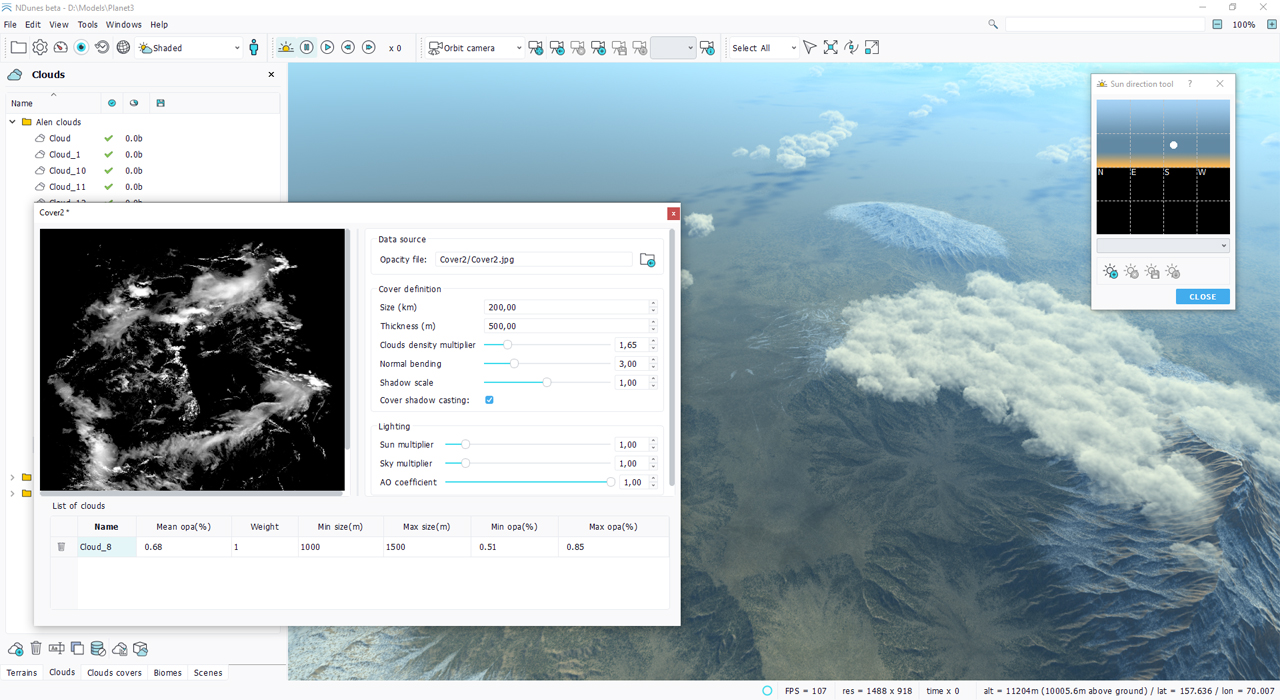 - The clouds cover can also cast shadows or not. It's interesting not to waste time casting shadows for clouds covers for example for high cirrus layers that will not have any visible effect anyway.