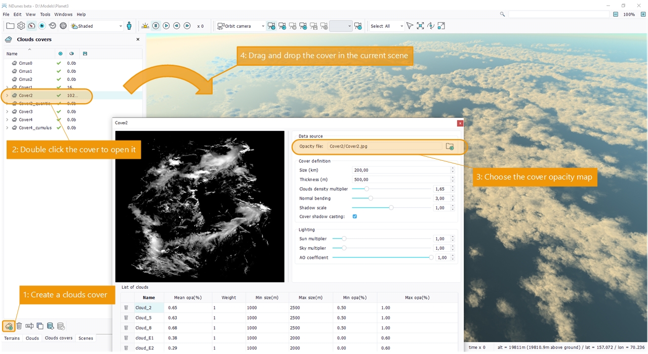 - Clouds fade start & stop distances that are common to all covers in the scene as well as the clouds density multiplier. These parameters are global settings that can globally interfere with the result for all covers displayed.