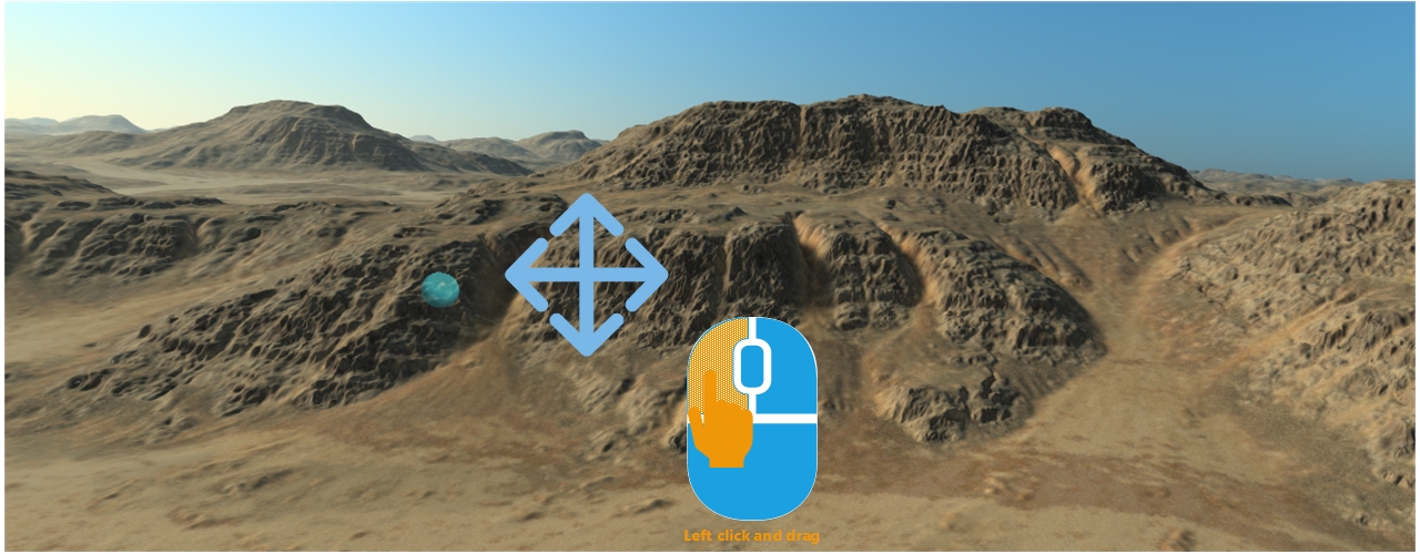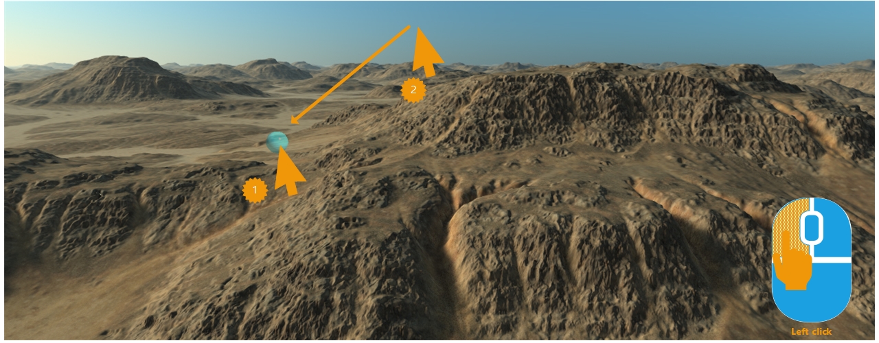 The view is translated by a left mouse button click followed by a dragging operation. If the mouse is over some geometry or over a landscape element (as illustrated by arrow 1 below), then the camera focus is set that element position. From this position, the translation gets defined. If the mouse is flying over the sky at the time of the operation (as illustrated by arrow 2), then the last focus point will be used.