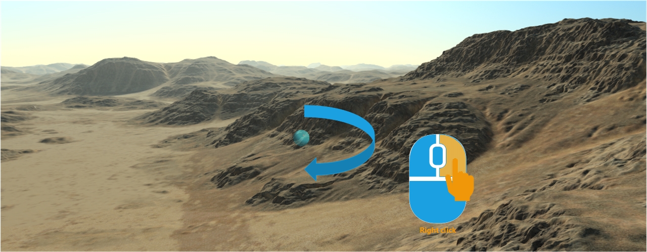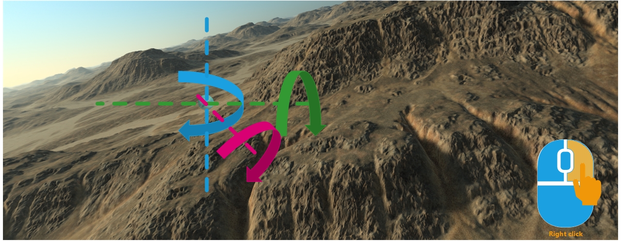 The view is rotated by a right mouse button click followed by a dragging operation. The focus definition mechanism is identical as the one illustrated above for translations. If the camera is an ORBIT camera, then the rotation occurs around the pitch and yaw axis defined at the focus point position: