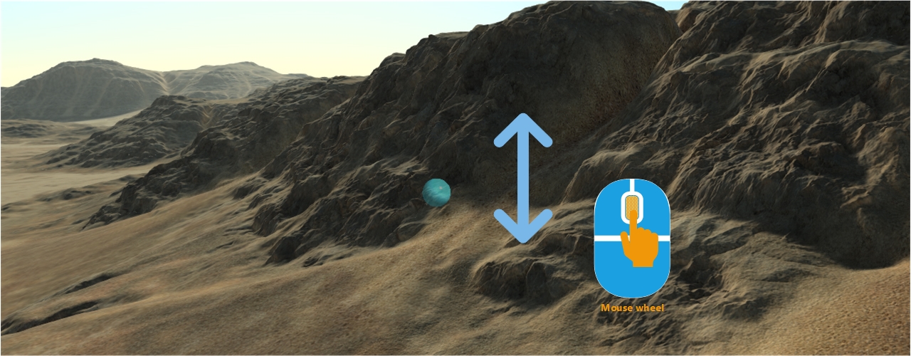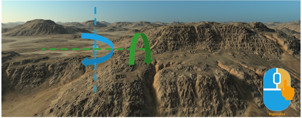 The camera Top-down mode places the view to look at the ground. Only one rotation is enabled around the up axis, left click pans the camera and the mouse wheel is used to move the camera backward or forward following the vertical up axis.