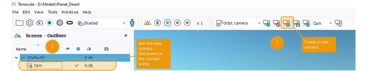 Press the "plus" button in the camera toolbar to create a new camera (marker 1 in image below). Rename it in the toolbar or in the current scene where it's now listed (marker 2):