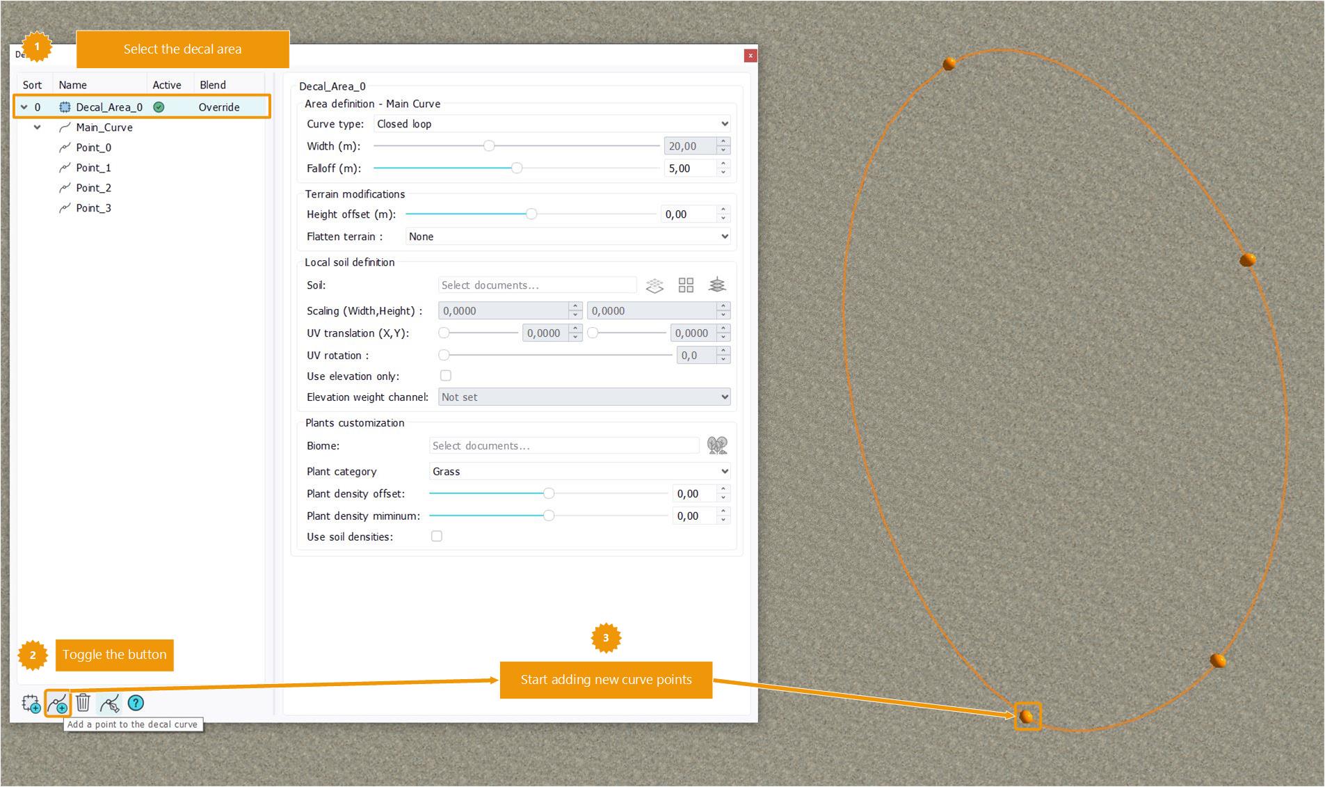 - Continuous contours : the new curve point is added at the end of the points list. The curve contours follows the points list in the order they were added. This is the best mode to create a new decal area curve, especially if you are trying to follow some contours from an overlay, the terrain or anything else.